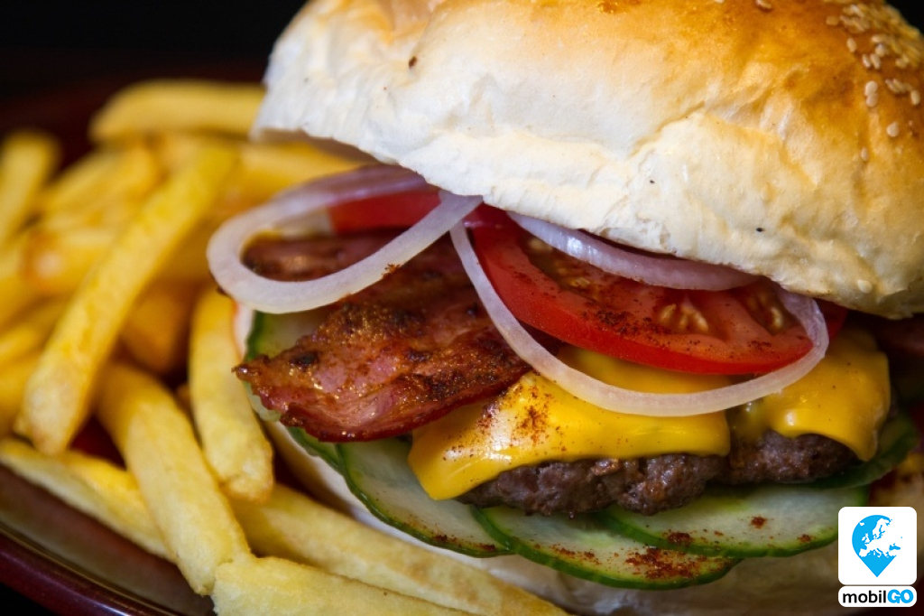 húspogácsa, főtt füstölt tarja, sajt, zöldségek, mustár, ketchup
