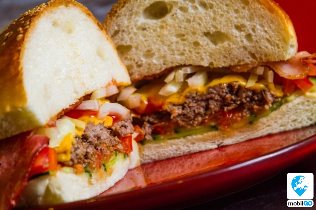 húspogácsa, bacon, zöldségek, mustár, ketchup