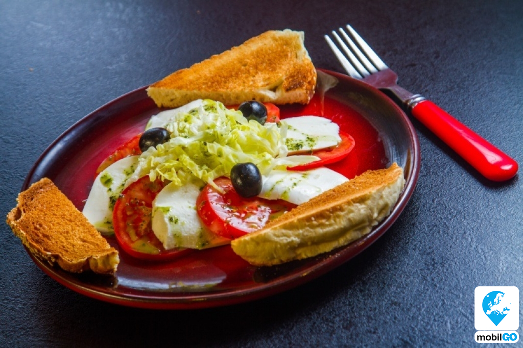 mozzarella sajt, paradicsom, pesto, olajbogyó, pirítós