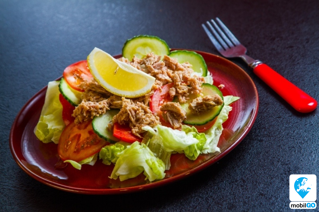 jégsaláta, uborka, paradicsom, lila hagyma, tonhal, olívaolaj, citrom