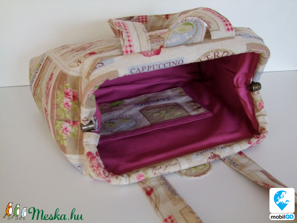 Vidám, tavaszias minőségi len-pamut vászonból varrtam, 30 cm-es keretre, mely összecsukva teljesen zárt. Nyitásához két kis fület varrtam.