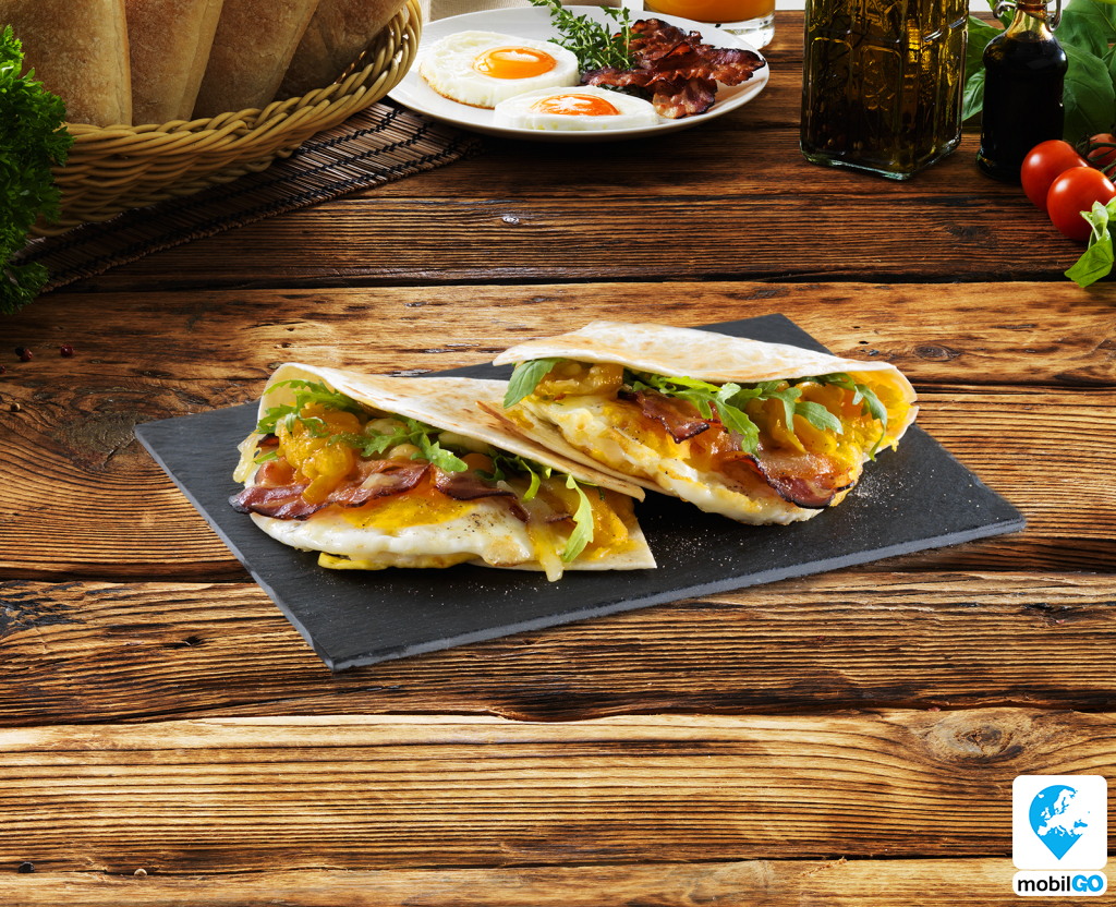 Friss hazai tojás a KFC titkos fűszereivel, sült bacon szeletek, reszelt cheddar, majonéz és rukkola, gabonatortillában összesütve.