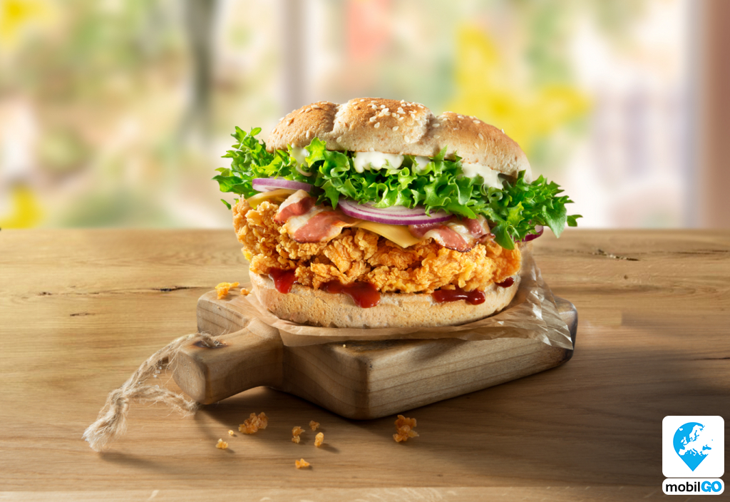 A Grander nagy, szezámmagos zsemléjének belsejében egy kézzel panírozott, friss csirkecomb filét találsz, melyet Hot&Spicy panírba forgatunk sütés előtt. A szendvicset egy szelet, ropogós baconnel dobtunk fel, majd mindezt tetéztük két szósszal: BBQ-val és majonézzel. Ráadásul ömlesztett cheddar sajtot, ízletes lilahagymát és friss jégsalátát is találsz a Granderedben. Egyszerűen remek.