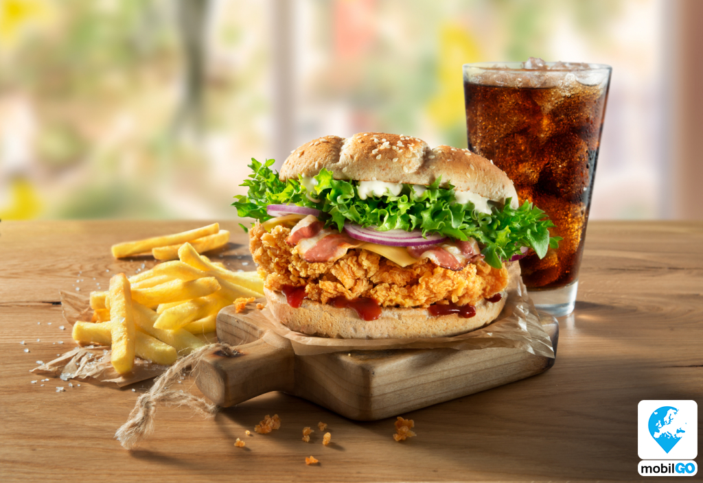 Hatalmas szezámmagos zsemle, benne kézzel panírozott, méretes csirkecomb-filé, ropogós bacon, ömlesztett cheddar sajt, ízletes lilahagyma, zsenge zöldsaláta és két öntet: karakteres BBQ és majonéz. Ehhez egy normál adag, aranybarna sültburgonya és az újratölthető üdítő dukál. Valami laktatóra vágysz? Ez neked való.