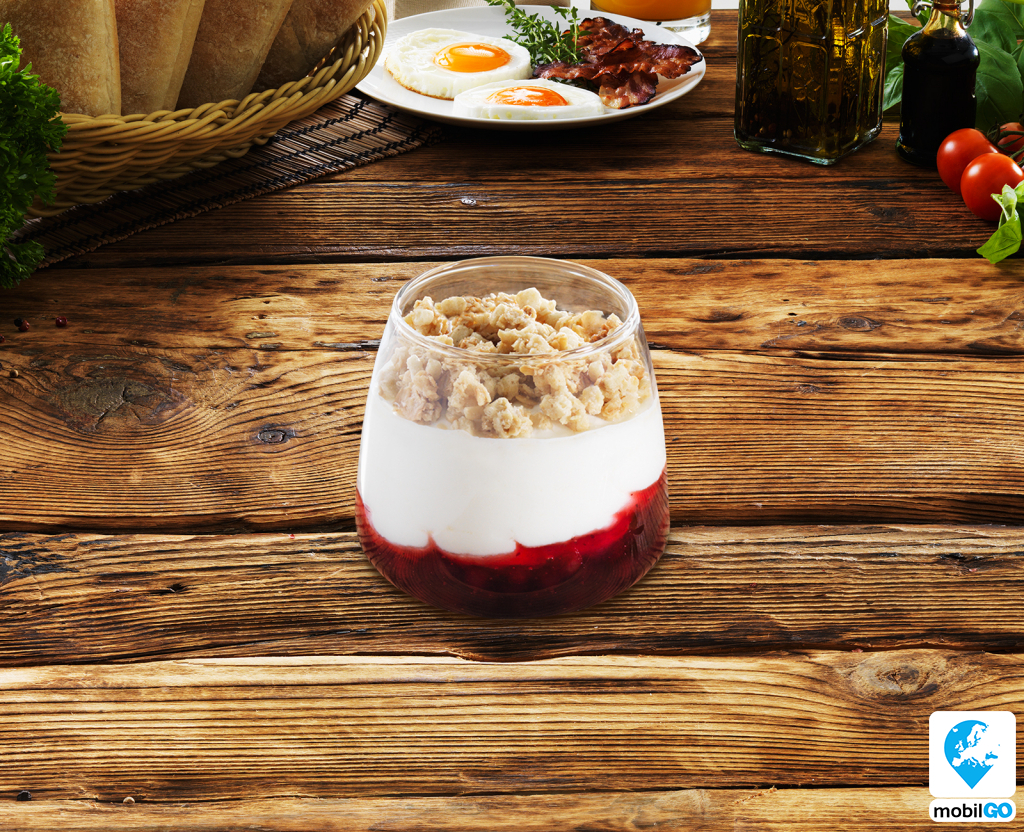 Áfonyaöntet és görög joghurt, a tetején ropogós müzlivel.